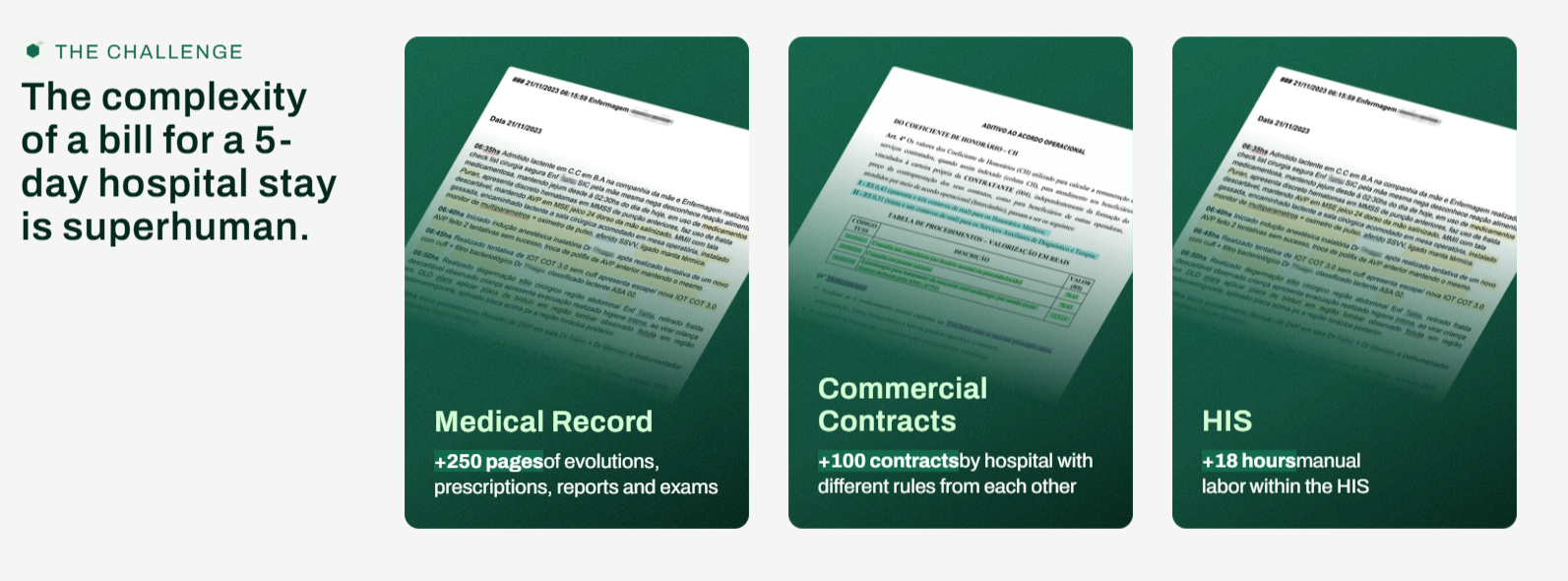 Co-founders Mateus Noronha and Diogo Freitas identified the opportunity after observing hospital billing teams at work, where administrative nurses reviewed extensive clinical documentation to ensure services were billed correctly. The process required specialized knowledge, took many hours per case, and relied on staff manually reconciling patient records with hospital systems.