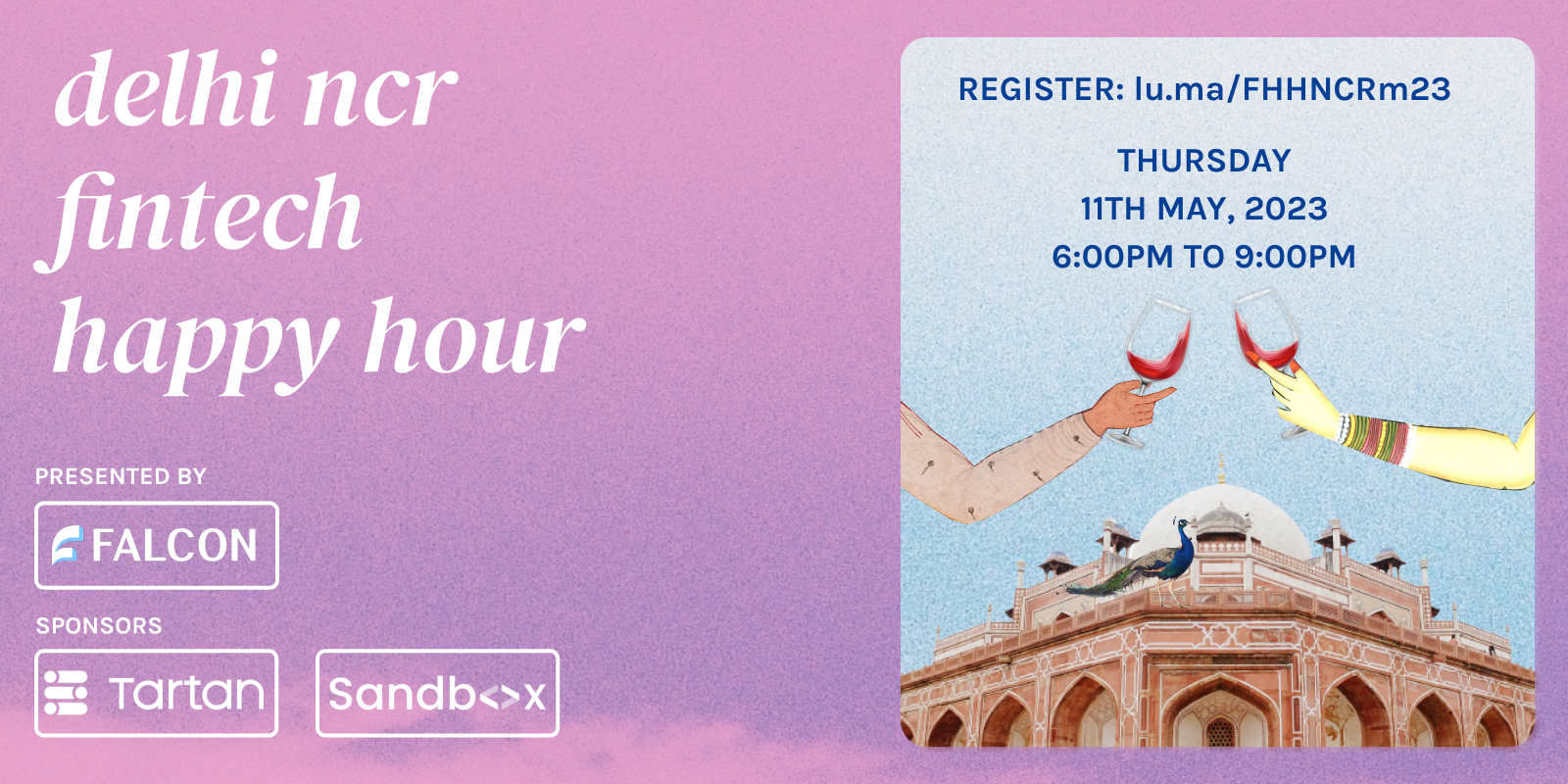 We're hosting our Delhi NCR Fintech Happy Hour presented by Falcon on Thur, 11th May, 2023! Nobody thinks Delhi NCR has a thriving fintech ecosystem - let's prove them wrong! Register with the link below and see you on Thursday!