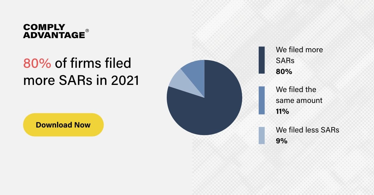 Suspicious activity report (SAR) filing trends reflect the continued volatility of the financial crime landscape. In the final months of 2021, ComplyAdvantage surveyed 800 C-suite and senior compliance decision-makers across North America, Europe, and Asia Pacific - our findings showed that 80% of firms said they filed more SARs in 2021, compared to 70% who said the same in 2020. Almost a third of respondents (31%) said they filed 10–20% more SARs in 2021 compared to 2020. Download the report today to uncover more financial crime trends for 2022: https://complyadvantage.com/insights/the-state-of-financial-crime-2022/