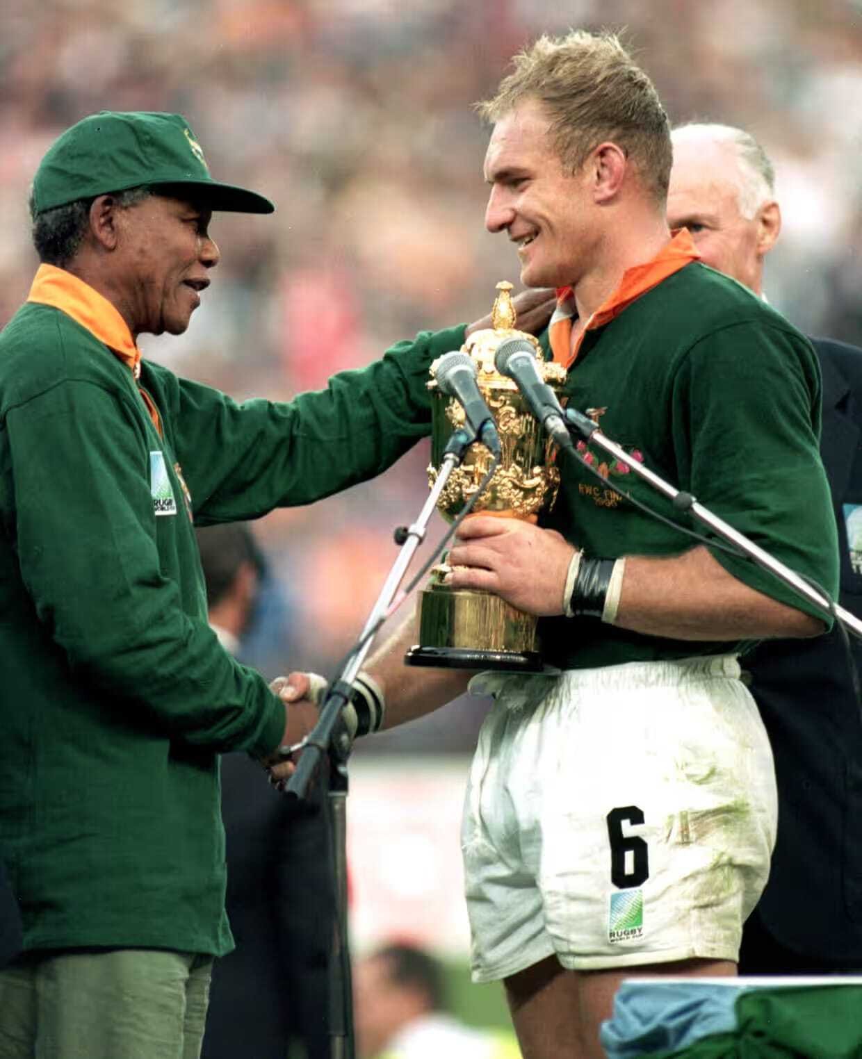South Africa's President Nelson Mandela congratulates Springboks rugby captain Francois Pienaar on winning the 1995 Rugby World Cup, the year after Mandela was elected. (Source)