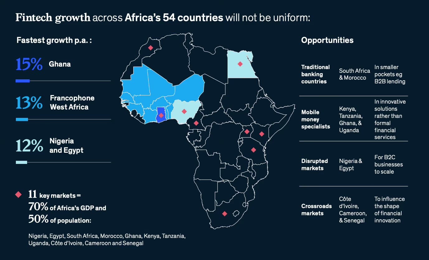 The African fintech market is expected to grow fastest in Ghana and Francophone West Africa, by 15% and 13% per annum respectively