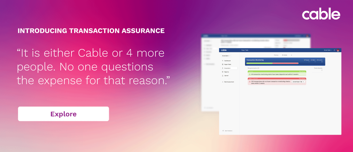 With major banks, fintechs, and crypto exchanges continuing to face historic AML penalties, Cable's Transaction Assurance emerges as a game-changer, ensuring 100% of transactions are automatically tested in real time, offering comprehensive compliance adherence.