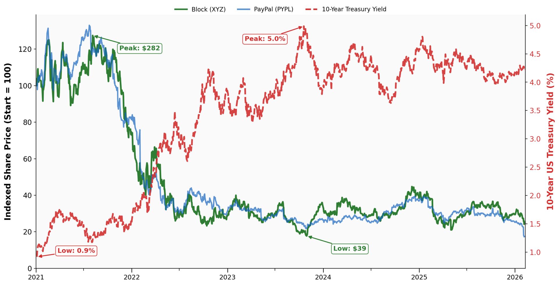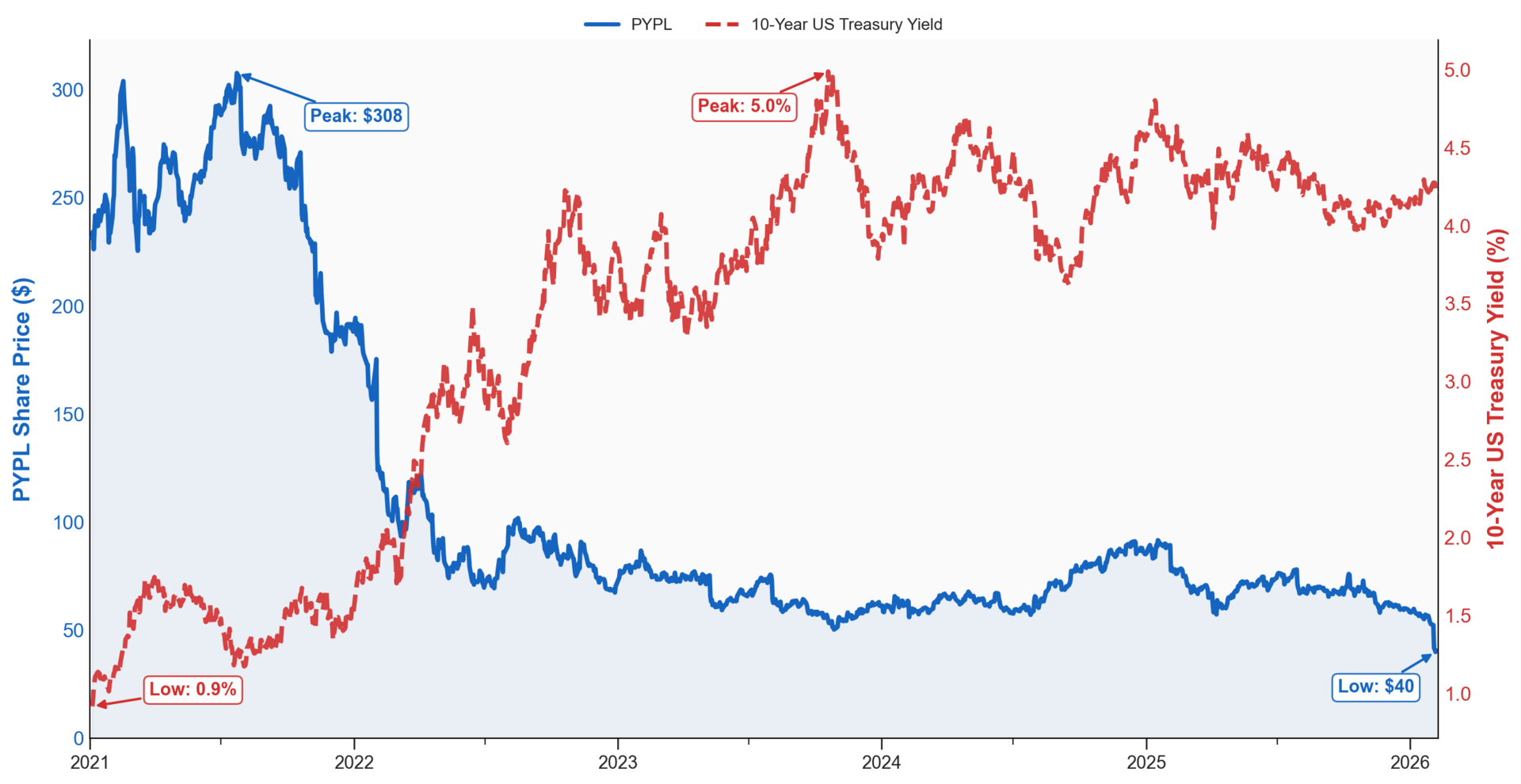 Chart shows PayPal stock price and Treasury Yields