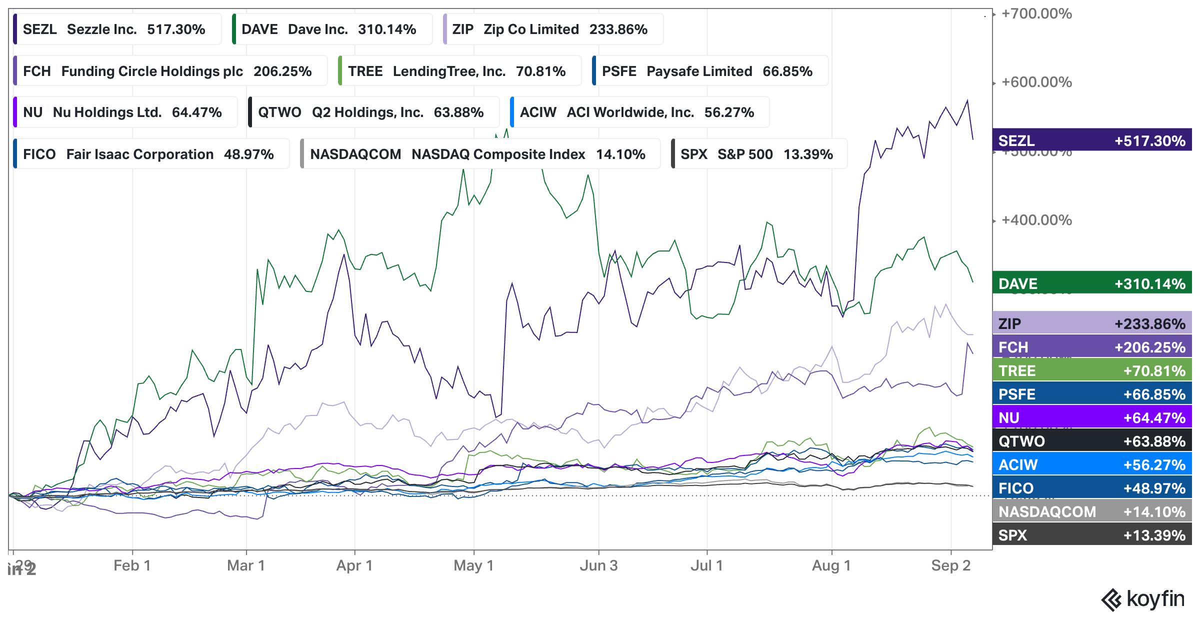 With Sezzle (NASDAQ: SEZL), Dave (NASDAQ: DAVE), and ZIP leading the list of the best-performing fintech stocks, we can probably call 2024 the year of "back from the dead" companies. Thus, last year Sezzle, at its lowest point, had a market cap of $47 million ($0.75 billion now), Dave had a market cap of $54 million ($0.47 billion now), and ZIP (ASX: ZIP) had a market cap of $130 million ($1.81 billion now).