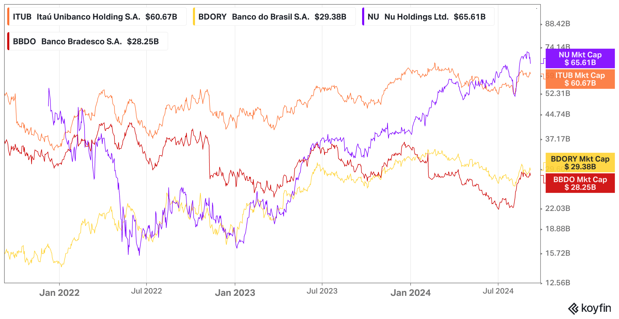 Nubank is playing in a league of its own, posting unprecedented growth rates while improving profitability. Thus, Nubank added 5.2 million new customers during the quarter (20.8 million during the last four quarters), reaching a total of 104.5 million customers. Deposits increased 64% YoY, interest-earning loan portfolio increased 81% YoY...while the Return on Equity improved from 17% in Q2 2023 to 28% in Q2 2024.