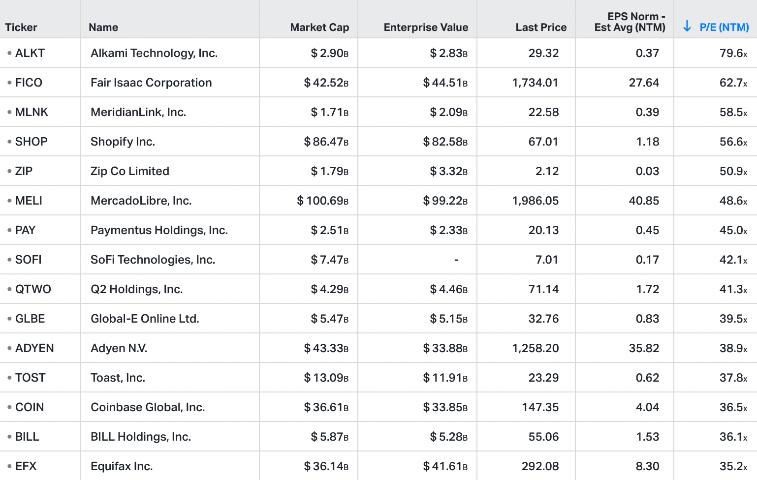 With so many fintech companies reaching profitability (on either an adjusted or non-adjusted basis), we have decided not to publish NTM Enterprise Value / Sales multiples and, instead, publish NTM Price / Earnings multiples.