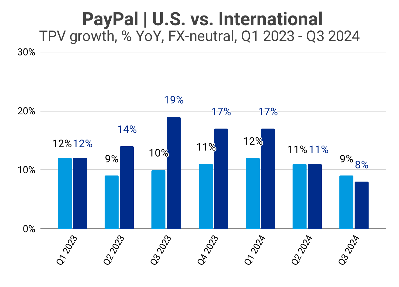 PayPal has "accepted a lower near-term Braintree revenue profile in exchange for better margins", as per the company's Chief Financial Officer, Jamie Miller. The company's management also expects "lower Braintree volume and revenue growth in the fourth quarter and through 2025." However, it seems that Braintree is not the only area that is impacted. Thus, international volume growth has also decelerated to 8% YoY in Q3 2024, down from 19% YoY in Q3 2023 (on a currency-neutral basis). The pivot to profitable growth is killing two key growth drivers.