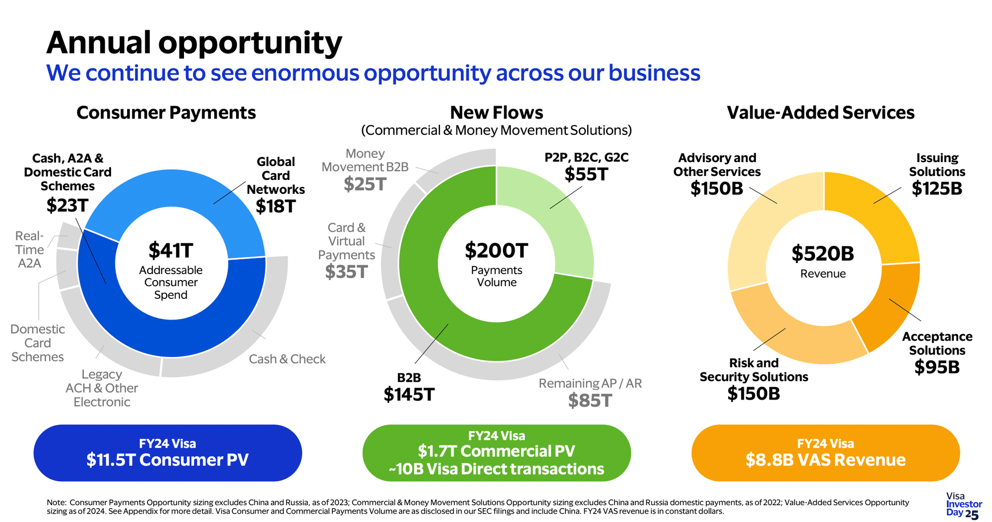 First of all, there’s still growth in consumer payments. Out of $41 trillion in global consumer spend, card networks captured just $18 trillion, with Visa taking $11.5 trillion. The rest is still in cash, checks, or account-to-account payments (or processed by domestic card networks). Visa masterfully drove the wave of digitalization of payments and is winning business from domestic schemes. However, over the long term, a bigger opportunity for Visa is in commercial payments, or what they call the "New Flows".