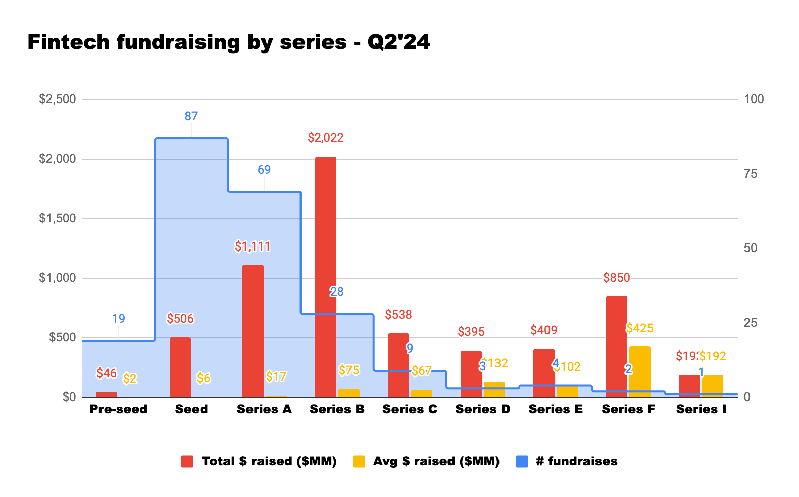 For the first time in over a year, total funding increased for Series A through later-stage rounds, which is consistent with an uptick in late-stage funding in the broader venture ecosystem. Much of the capital that fintechs amassed in Q2 came from mega-rounds (+$10M)– notably, Abound’s £800M debt+equity raise, Stripe’s $694M employee secondary (which vaulted Stripe to a $65B valuation) and AlphaSense’s $650M Series F.