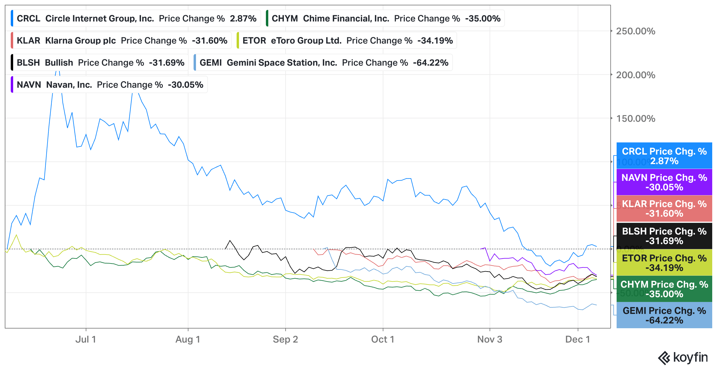 Unfortunately, the excitement faded quickly. Nearly every newly public fintech now trades below its IPO price, often by a wide margin. Even Circle’s extraordinary run has reversed: the company priced its IPO at $31 per share, surged to nearly $300, and now trades around $85. The narrative has shifted from celebration to familiar debates about valuation multiples and the sustainability of growth.
