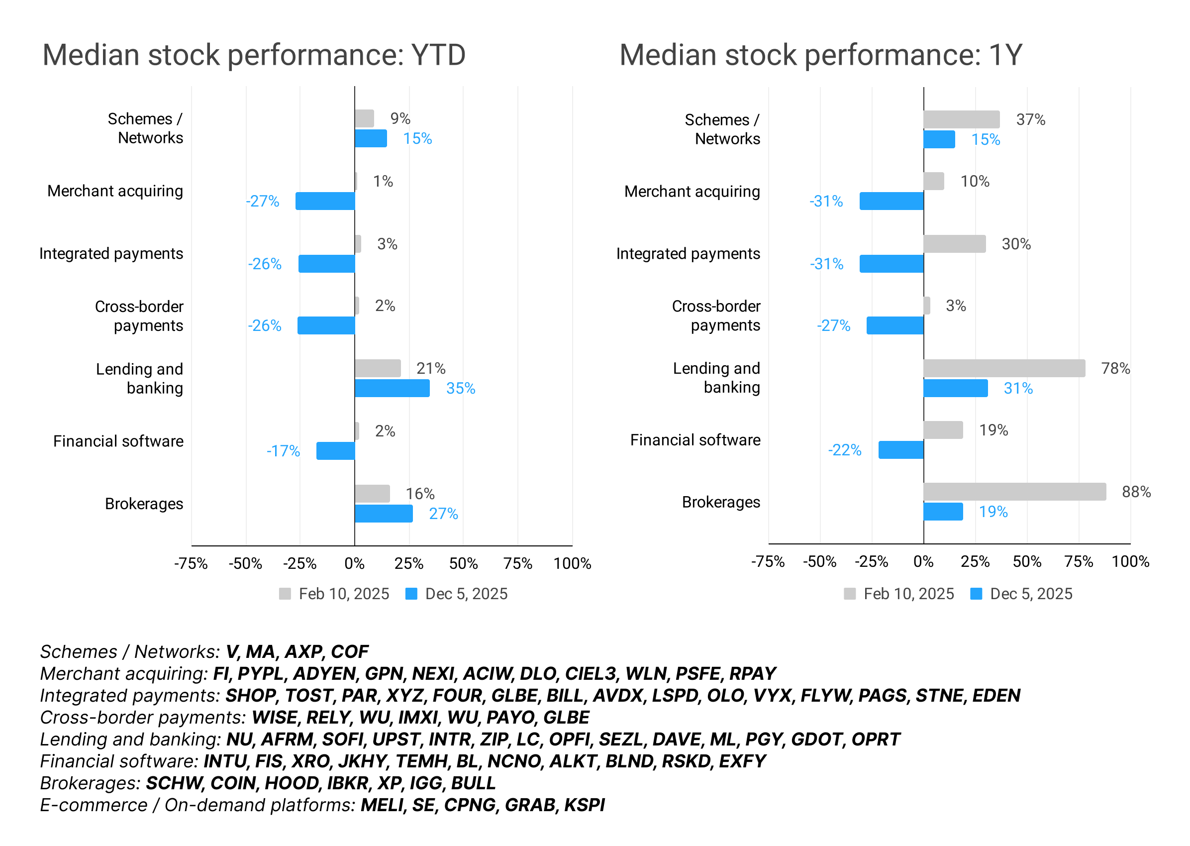 At the beginning of the year, we introduced a new section: stock performance by segment. Grouping fintech companies into buckets isn’t easy, but as with the TWIF Index, the goal wasn’t scientific precision; it was to give a rough temperature check by segment.