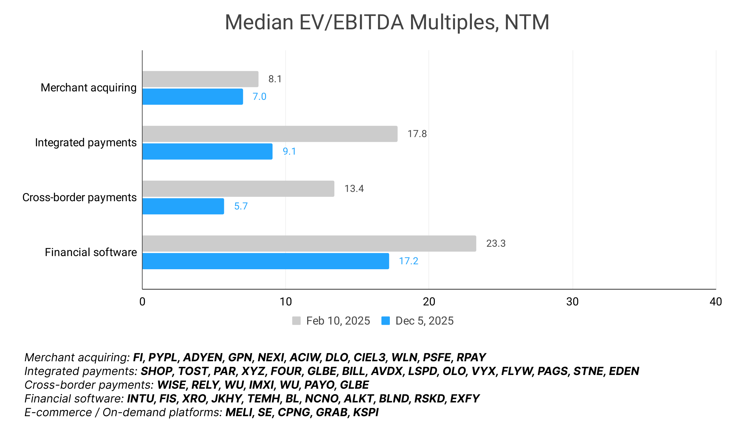 Incumbents struggled the most. FIS and Global Payments announced a blockbuster deal that the market didn’t seem to appreciate. Fiserv had an outright brutal year, losing nearly three-quarters of its value as it was forced to reset growth expectations under the new leadership.