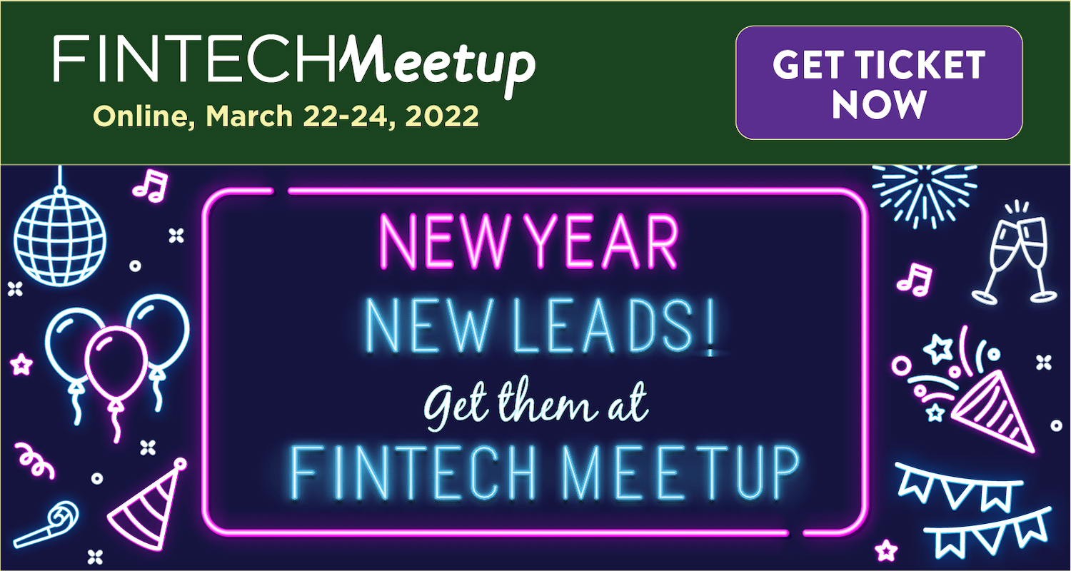 2022 predictions–3,000+ Fintech Meetup will get you Leads Partnerships Funding Investment Opportunities Join 500+ organizations who have already signed up to the world’s largest fintech meetings event. It’s the easiest way to meet Fintechs, Banks, Credit Unions, Community Banks, Investors, Networks, Solution Providers, Tech cos, Retailers & Merchants and many others. Online, March 22-24. Get Your Ticket and start planning for 2022!