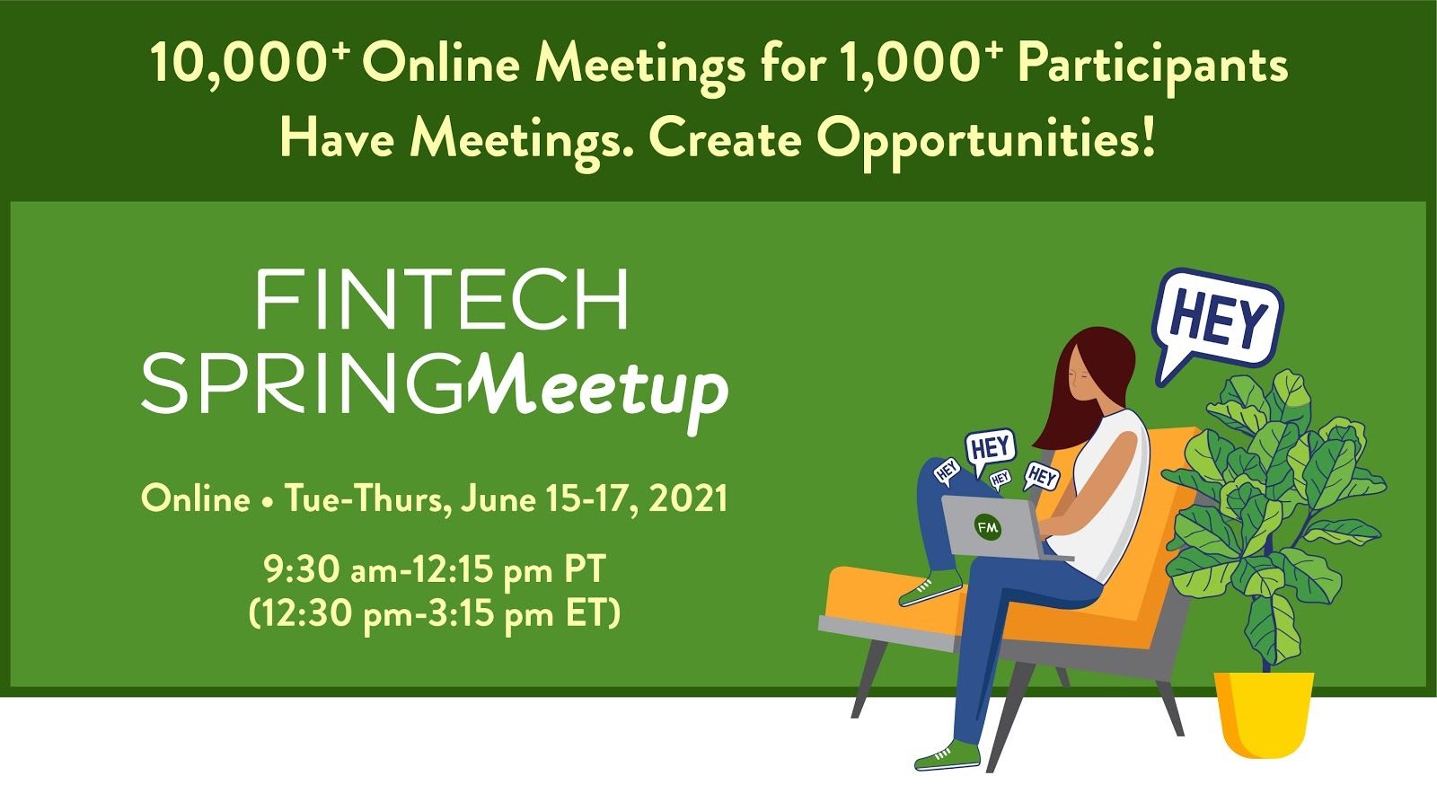 Join Fintech’s largest online interactive community! Introducing Fintech Spring Meetup -- a new online event designed to get you 3 months’ worth of meetings in just 3 half-days. Connect with the People You Know & Meet the People You Don’t. No Webinars. No Content. Just Meetings. Get Business Done! Learn More & Join Waitlist.