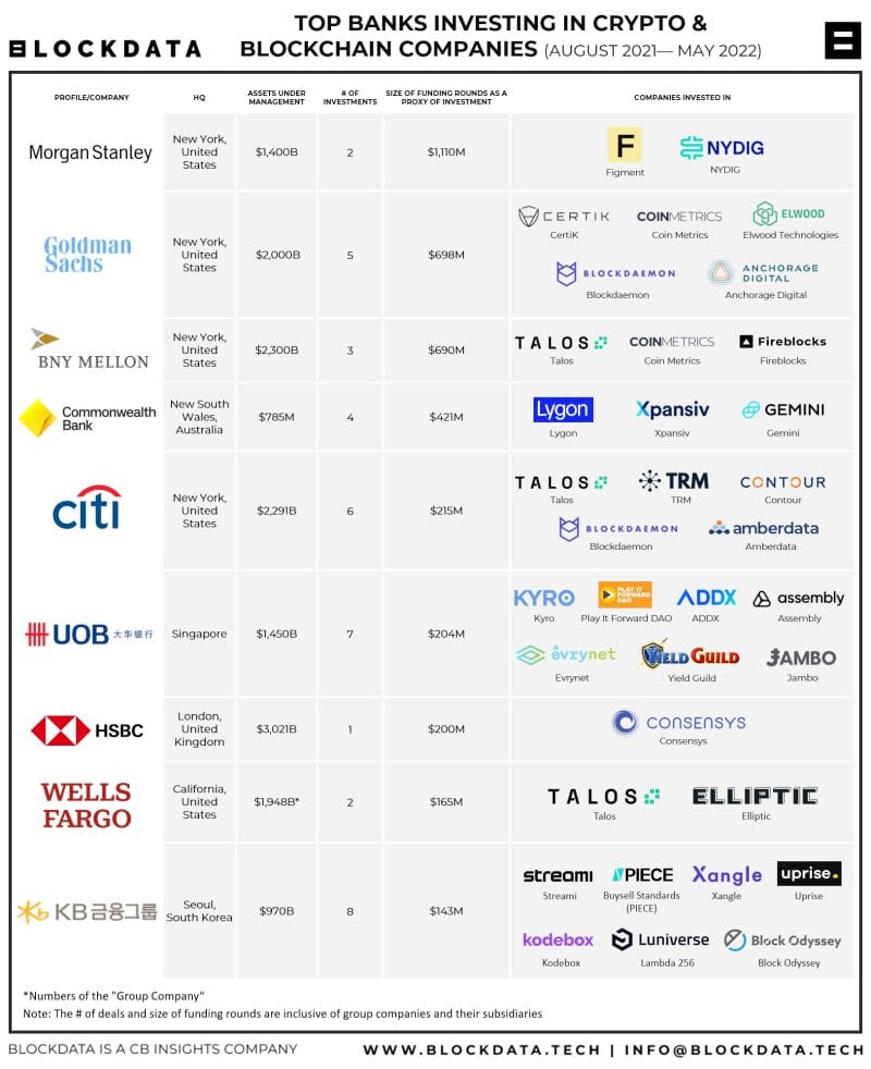 Per BLOCKDATA, as of last month, 23 major banks have made investments in blockchain or crypto-related entities: