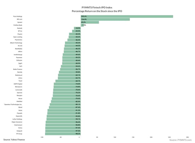 Though the Fintech IPO Index is up 55.7%, only four of the more than 40 names in the index are trading above their offer price.
