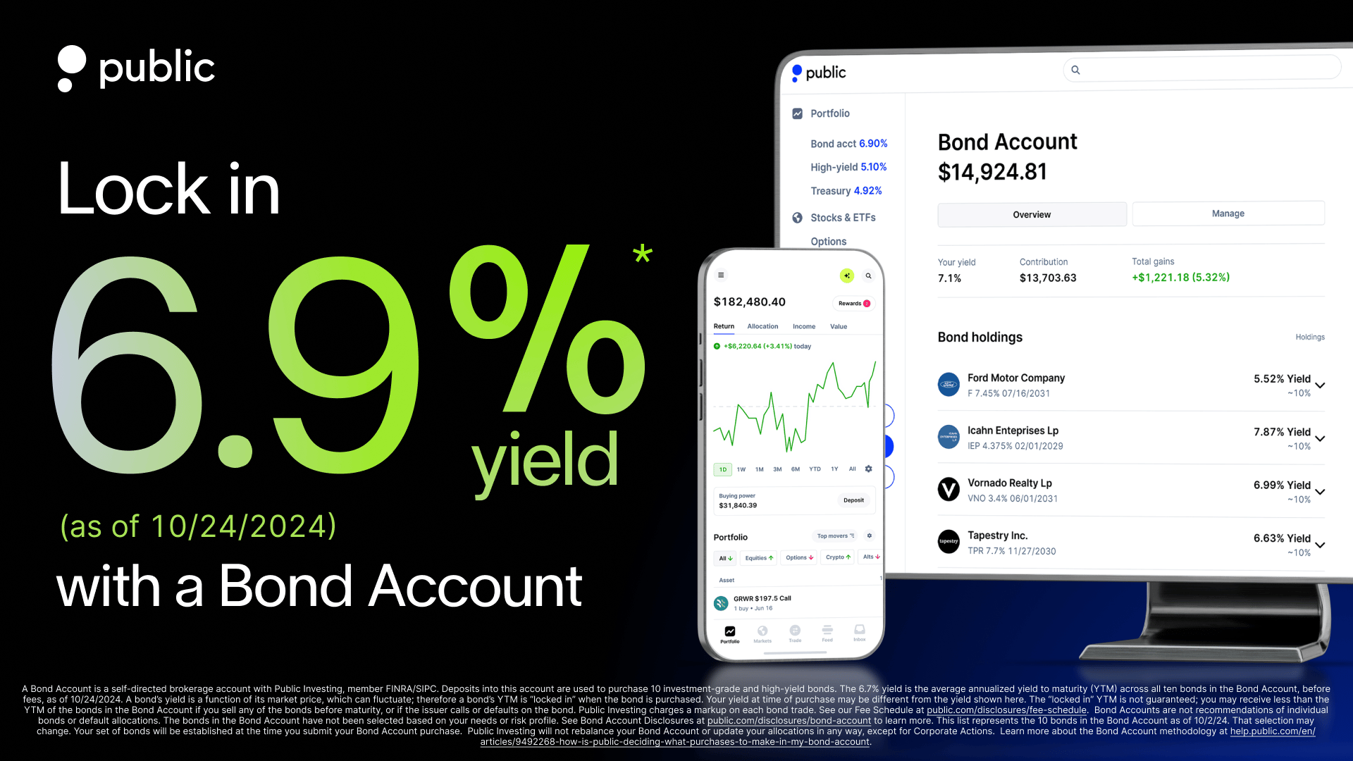 A Bond Account is a self-directed brokerage account with Public Investing, member FINRA/SIPC. Deposits into this account are used to purchase 10 investment-grade and high-yield bonds. The 6.6% yield is the average, annualized yield to worst (YTW) across all ten bonds in the Bond Account, before fees, as of 10/24/2024. A bond’s yield is a function of its market price, which can fluctuate; therefore a bond’s YTW is not “locked in” until the bond is purchased, and your yield at time of purchase may be different from the yield shown here. The “locked in” YTW is not guaranteed; you may receive less than the YTW of the bonds in the Bond Account if you sell any of the bonds before maturity or if the issuer defaults on the bond. Public Investing charges a markup on each bond trade. See our Fee Schedule.