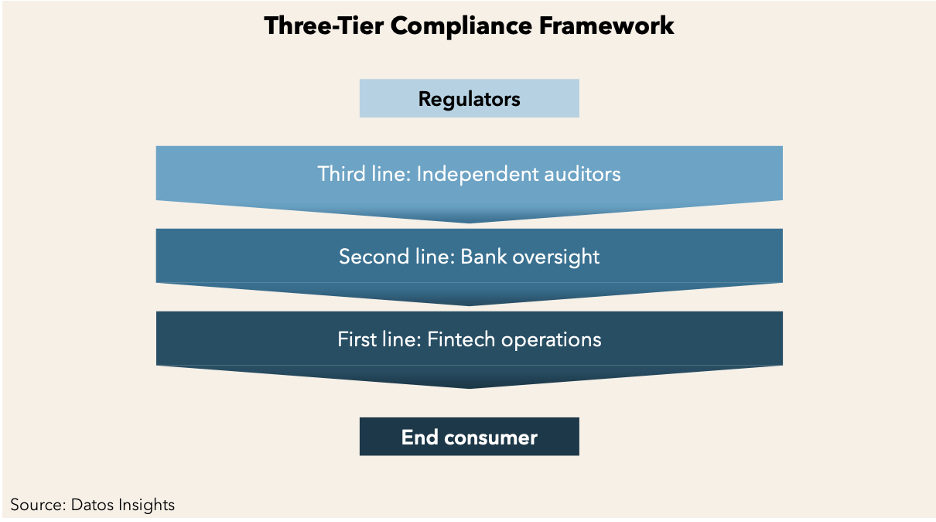 2. Implementing a robust three-tier compliance framework (fintech operations, bank oversight, independent audits)